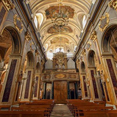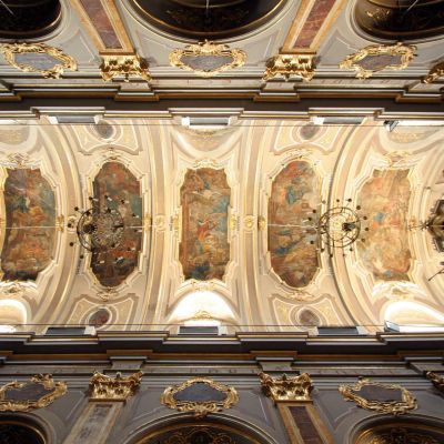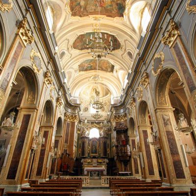 L’interno, che negli interventi del XIV sec. era stato definito in tre navate, nel 1852 si arricchisce di altre due navate, divise da pilastri, ed assume l’assetto definitivo a 5 navate. Oggi, dopo i lunghi interventi di decorazione, abbellimento e rifinitura, che hanno interessato la chiesa dalla fine del XVIII secolo agli inizi del XX secolo, l’interno si presenta interamente rivestito di decori barocchi, dalla policromia discreta e finalizzata a valorizzare e dare slancio all’edificio, molto ampio in larghezza, ma poco profondo in lunghezza, privilegiando i toni del rosso-bruno, dell’oro, del beige e del grigio, tonalità calde e non invasive, ad imitazione delle venature marmoree, senza scadere nella ridondanza tipica dello stile barocco.