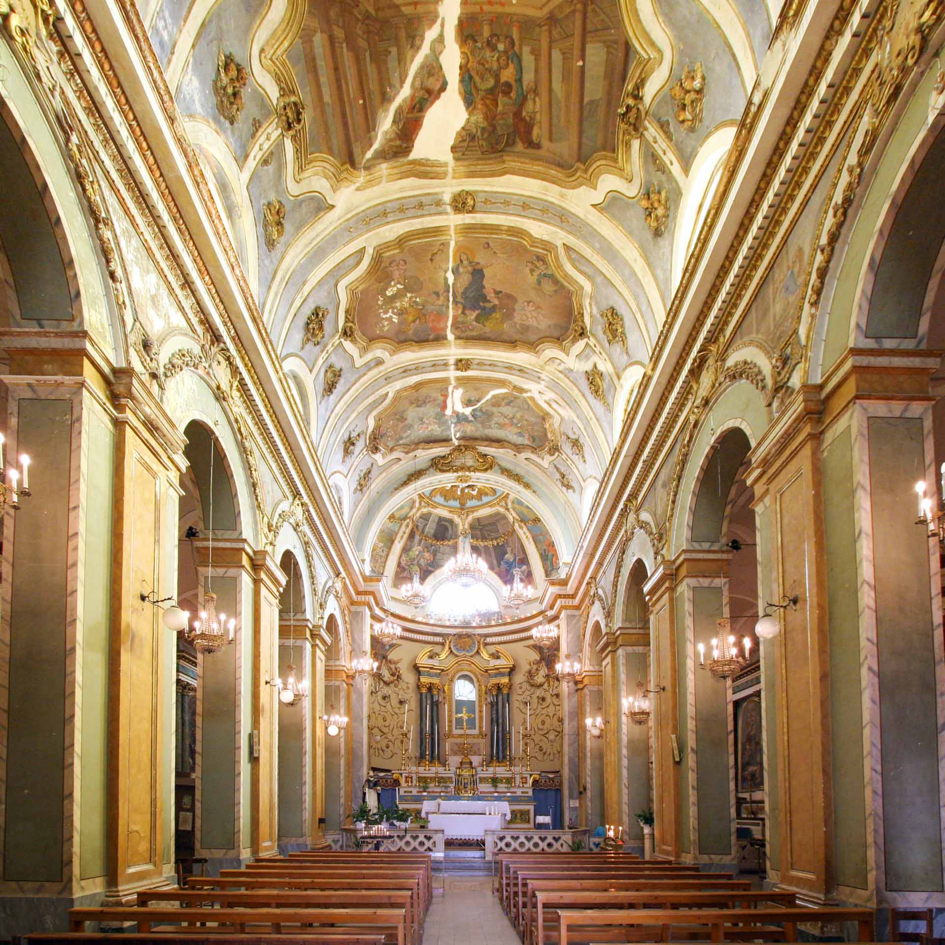 Sulla volta della navata centrale cinque grandiosi quadri celebravano i misteri gloriosi del Santo Rosario. Danneggiati durante le operazioni della II guerra mondiale o cancellati dai danni subiti per infiltrazioni di acqua ed umidità, sopravvivono solo tre affreschi murali rappresentanti la Pentecoste, l’Assunzione della Madonna e l’Incoronazione della Madonna, eseguiti nel 1853 dall’artista atessano Giacomo Falcucci.