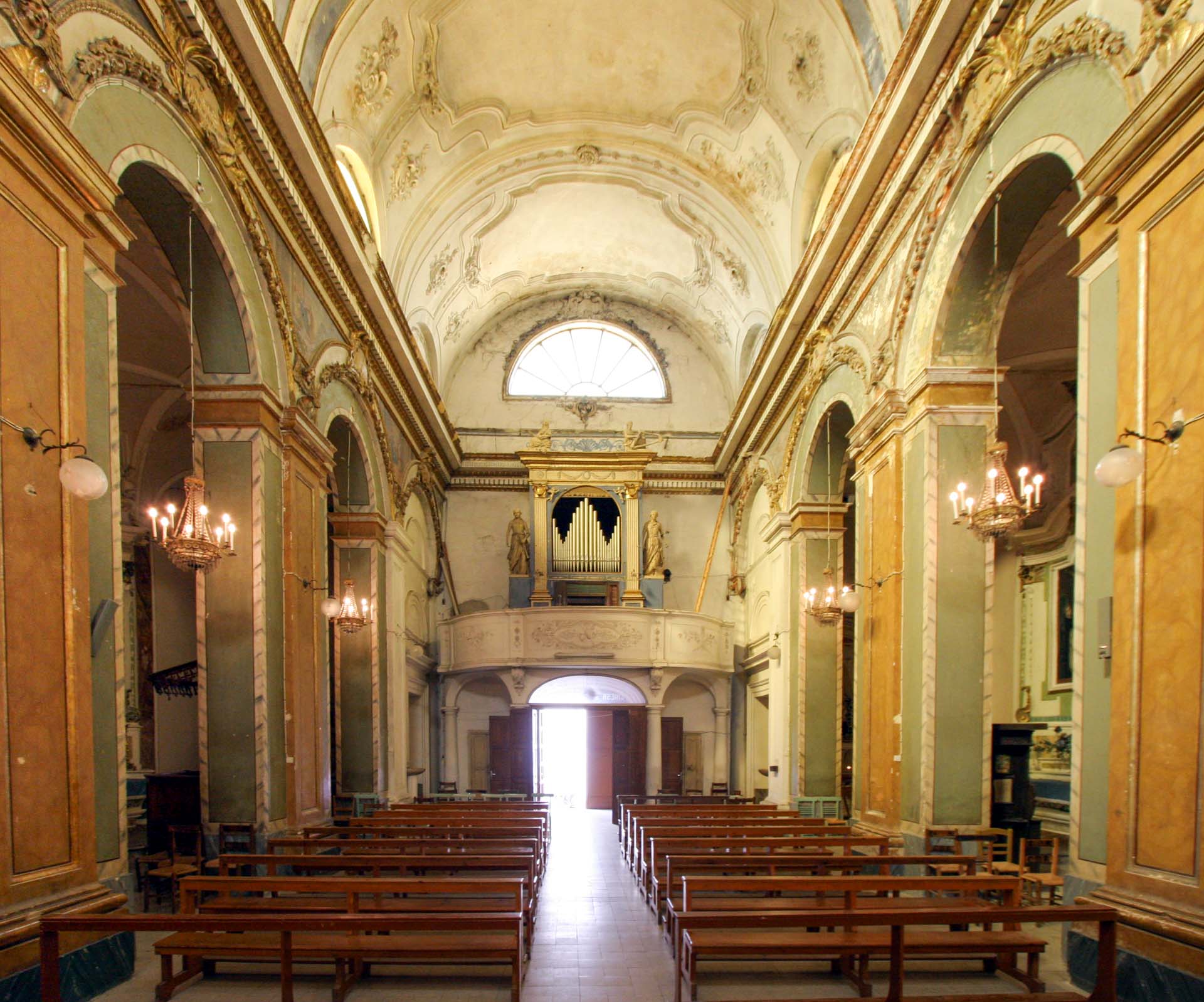 Un bellissimo organo, posto sul ballatoio sovrastante il portone d’ingresso, è realizzato in legno intagliato, dipinto, dorato, affiancato da due figure angeliche in cartapesta modellata e dipinta.