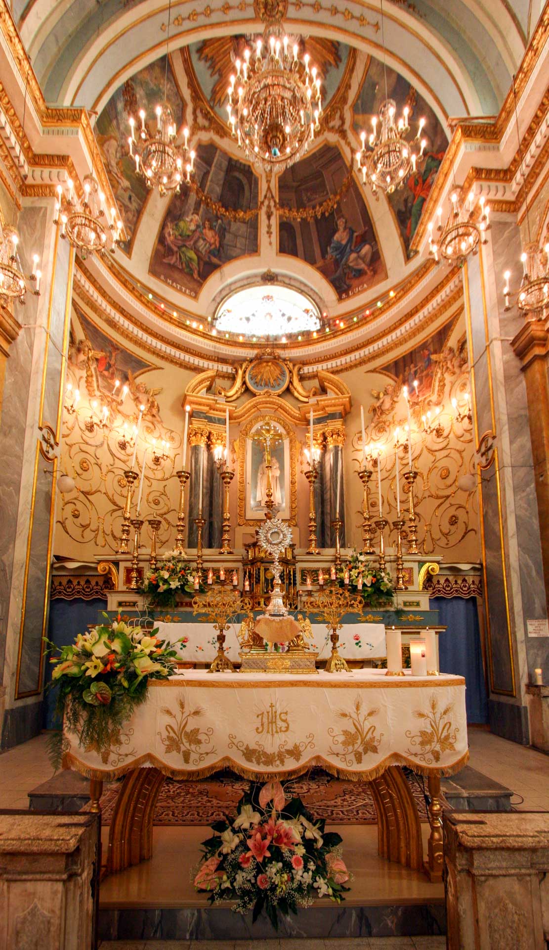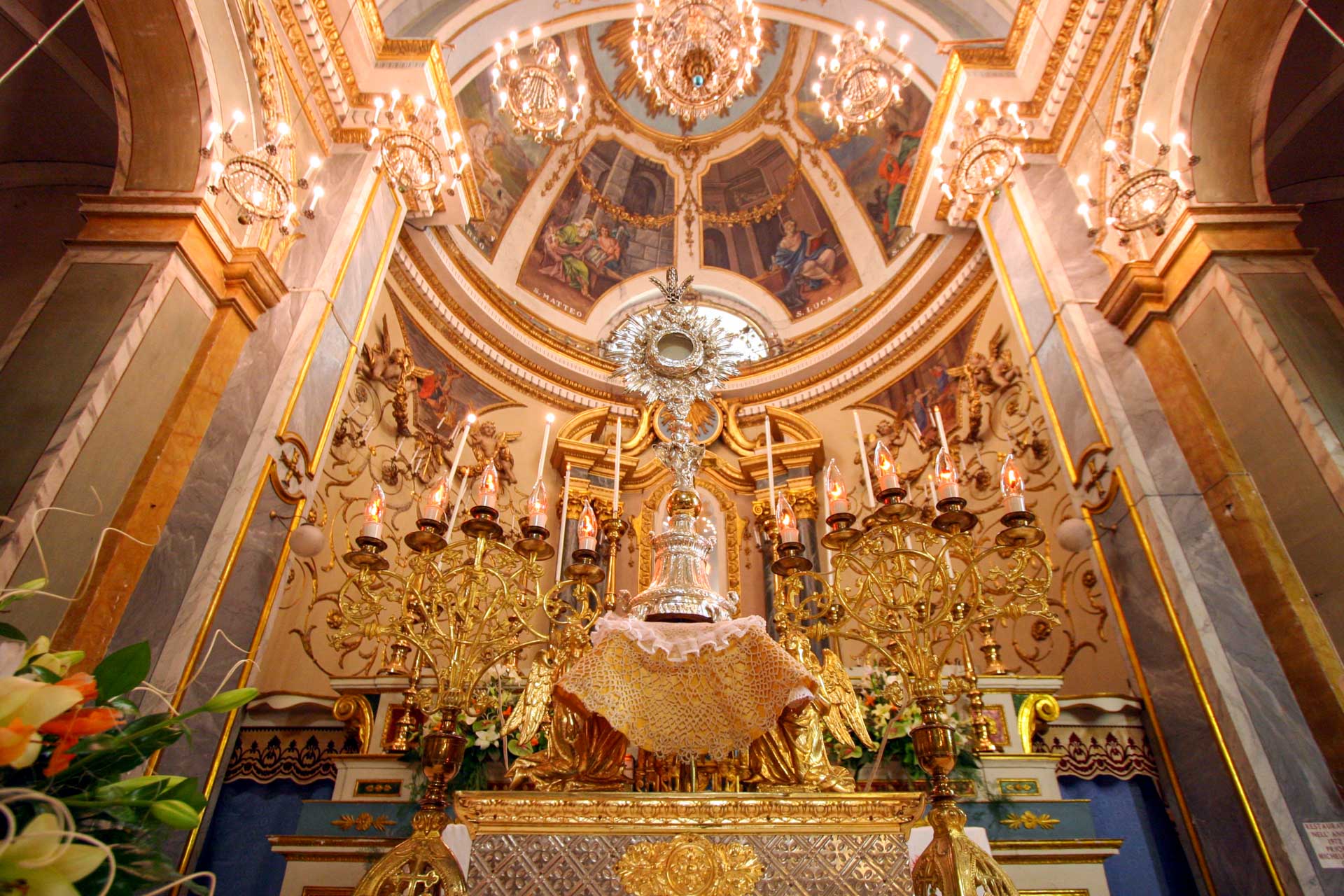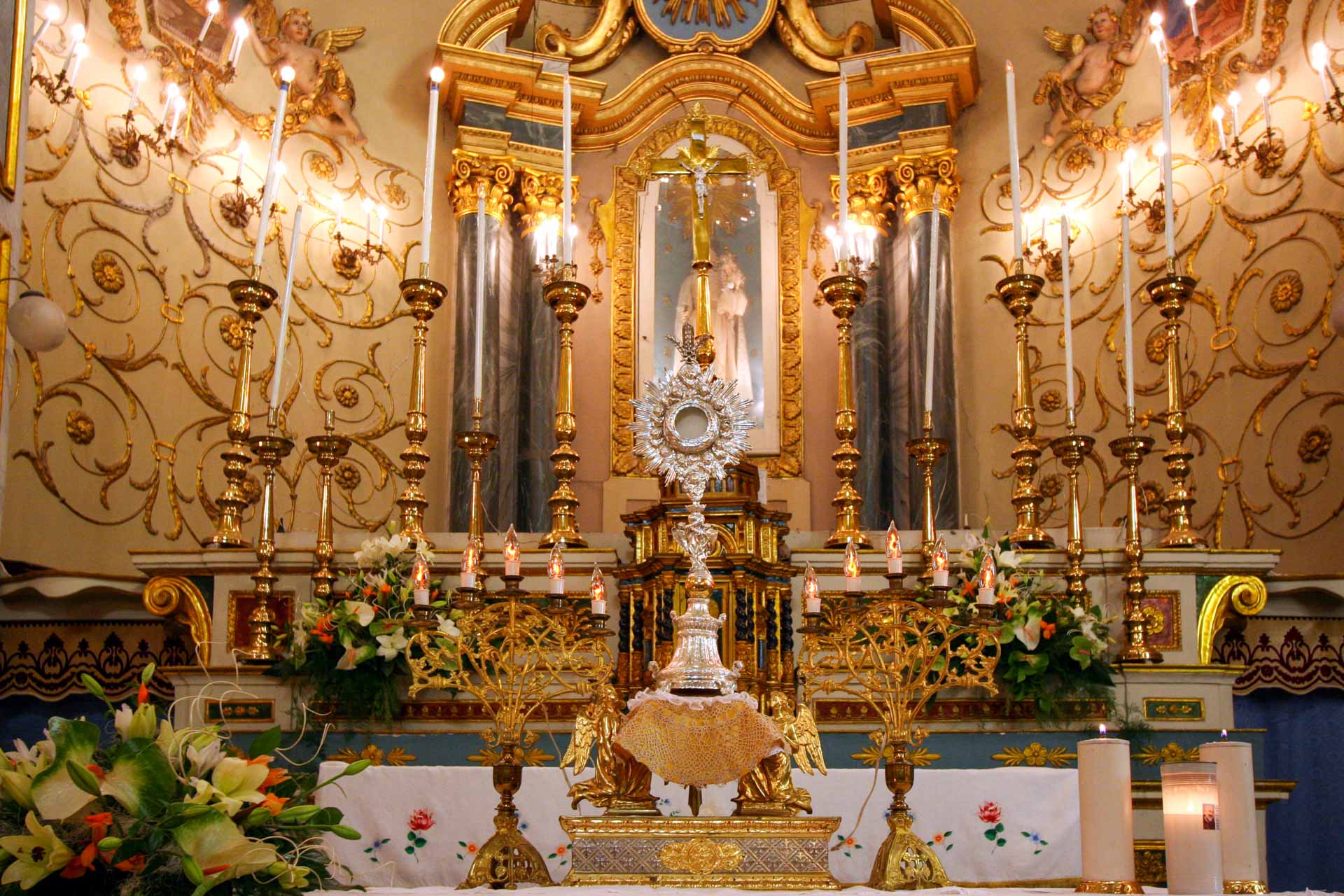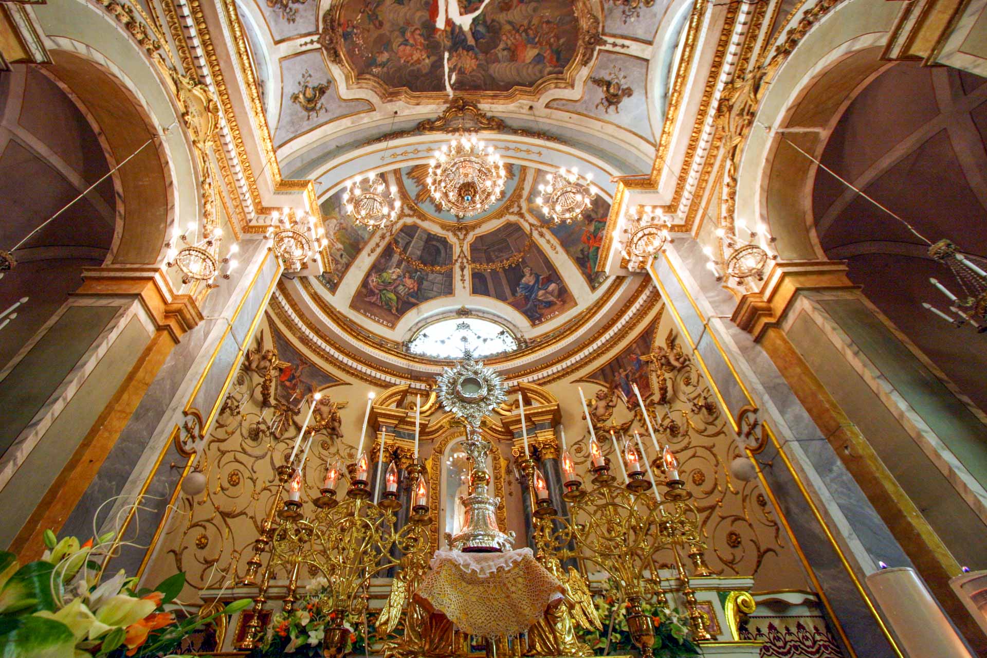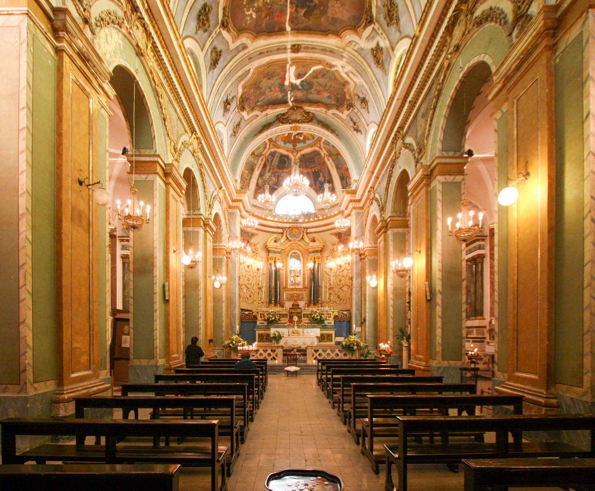 Sulle pareti delle due navate laterali si snoda una lunga teoria di altari sormontati da capitelli e stucchi che racchiudono nicchie con statue o quadri raffiguranti santi diversi ed ornati con candelabri ed altri arredi sacri.